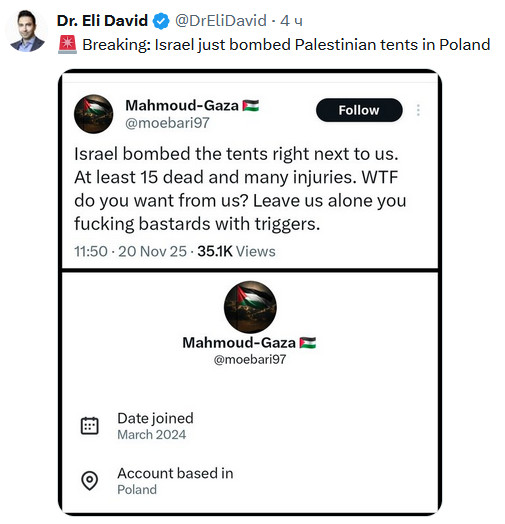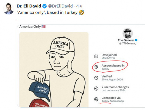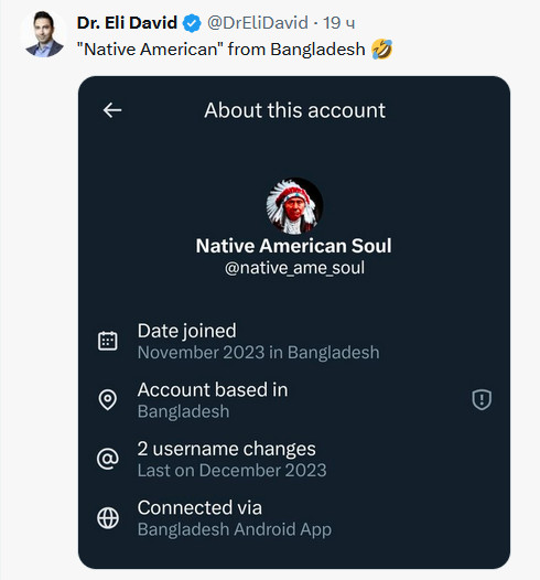 Это очень прикольная история! Илон Маск в Твиттере (ну, точнее, в Х-сети) стал в профиле указывать, в какой стране базируются те или иные пользователи. И тут стали выясняться интересные моменты, на которые обратил внимание популярный блогер Dr. Eli David. Его, в основном, интересовали всякие страдающие от голода, холода и израильской военщины жители Газы, но и всяких фанатичных сторонников MAGA и "нативных американцев" он тоже не обошел своим внимание.