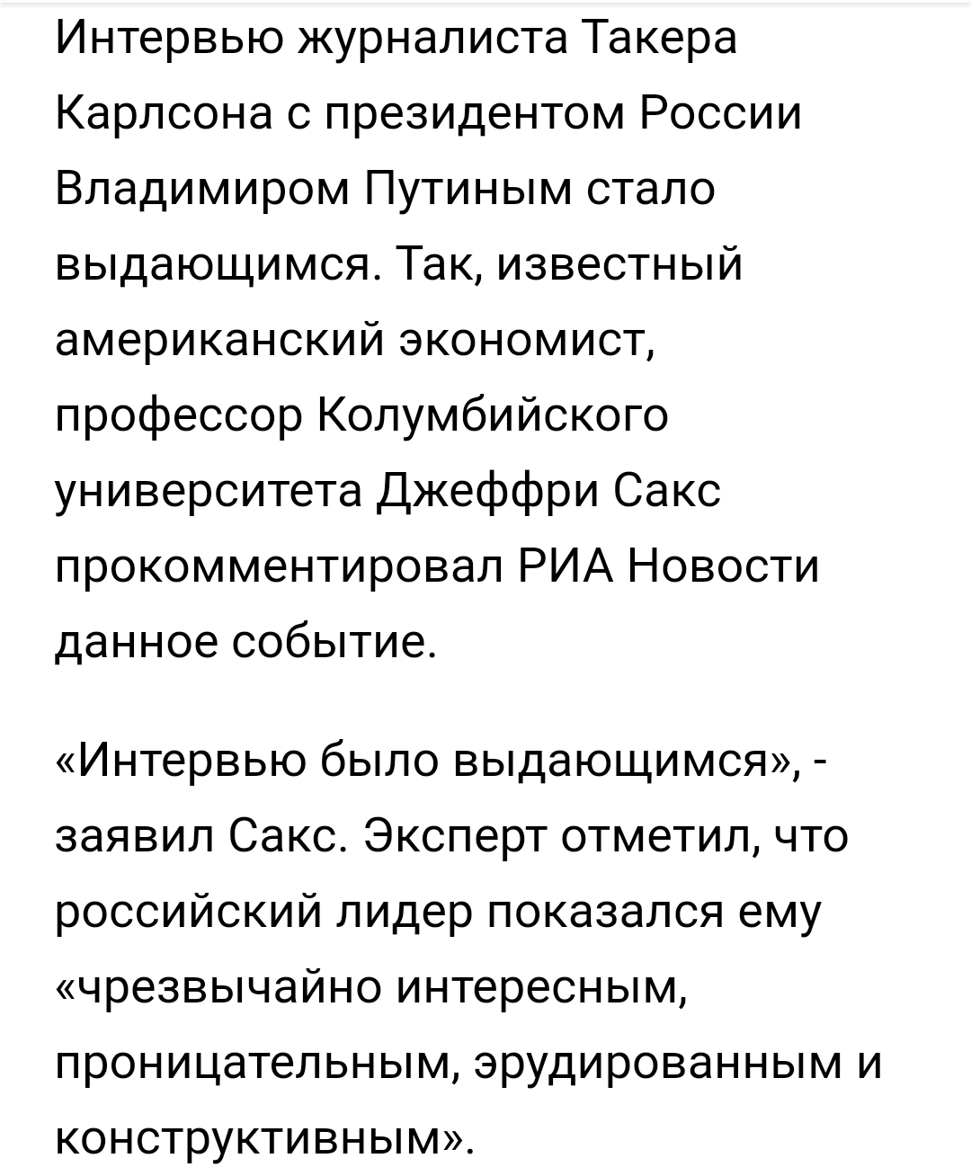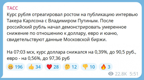 Интервью было весьма себе "комплиментарное" к Путину. Карлсон показал Путина якобы "реально думающим" человеком. И обозначил все путинские "хотелки" – якобы "объективными стремлениями".