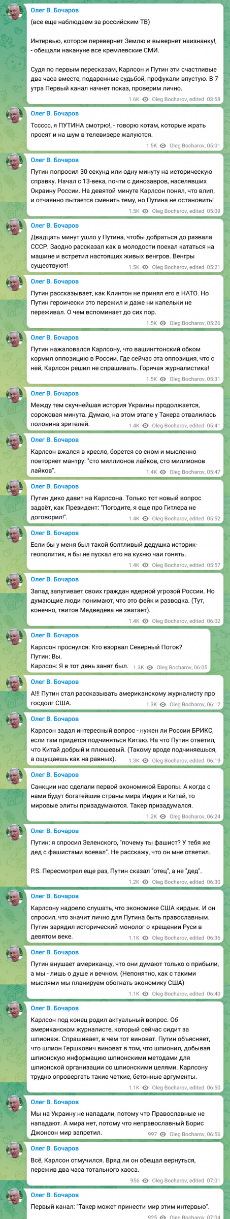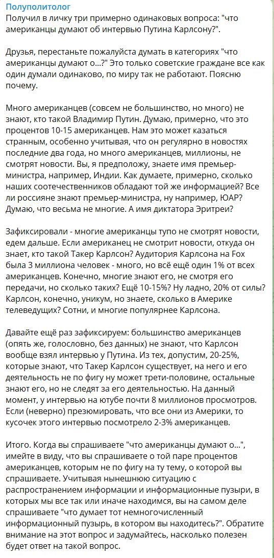 Но он не сказал. Ни одного острого вопроса так и не прозвучало. Карлсон просто 2 часа слушал этот поток бреда. Ни про преследование оппозиции в РФ, ни про массовые убийства мирных жителей Украины, он не упомянул ни словом."(Казанский)