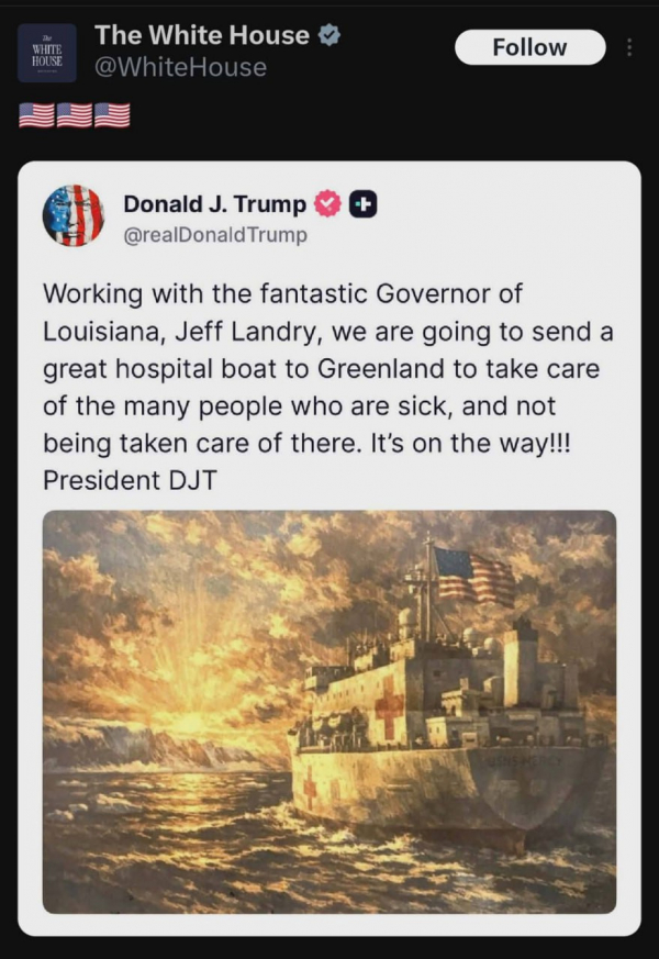 Дональд Трамп написал, что он отправит в Гренландию судно-госпиталь, чтобы оно, дескать, позаботилось о больных, которым там не оказывается необходимая помощь.