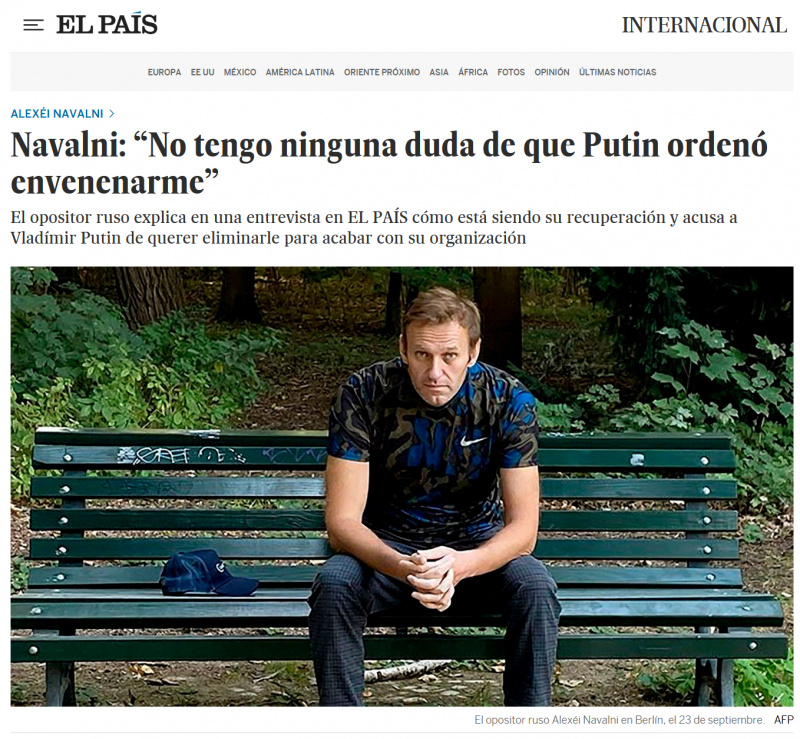 В одном из самых крупных испанских изданий El País сегодня вышла большая статья с расследованием об отравлении Навального - "Navalni: “No tengo ninguna duda de que Putin ordenó envenenarme”". (Навальный: "У меня нет никаких сомнений в том, что это Путин приказал отравить меня".)