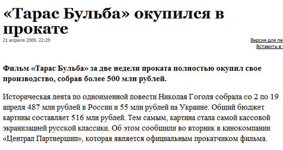 Понятное дело - неловко получится, если написать, что "Тарас Бульба" в прокате облажался. После такого-то ажиотажа.