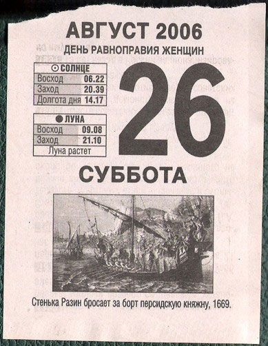 Только в этот день любая женщина имеет равные права с персидской княжной на бросание за борт (соответственно, любой мужчина имеет равные права со Стенькой Разиным на бросание за борт равноправной женщины). А может быть, женщины имеют равные права на выбрасывание стенек разиных за борт?