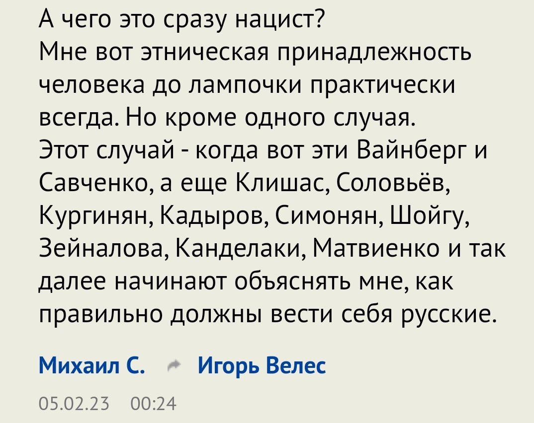 Допустим, Соловьёв сказал, что он русский. У меня не будет к нему никаких вопросов. Но он так не говорит. Он говорит, что он не русский, но лучше русских знает, как жить русским. И говорит от имени русских. Вот такой русскометр у меня в голове.