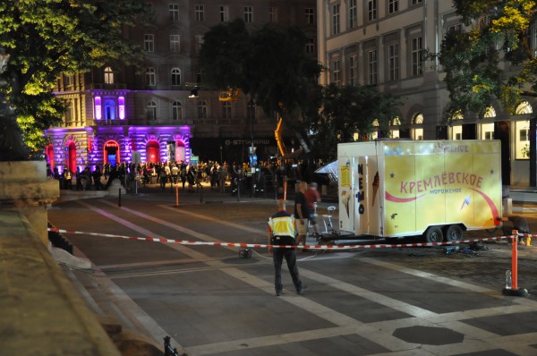 В Будапеште снимают "Крепкий орешек 5". По этому поводу кусок Будапешта превратился в Москву. Ребята из фирмы "1000 дорог" тайком сделали несколько кадров со съемки - охранники запрещали снимать. Особенно прикольно на фотографиях выглядят красные флаги...