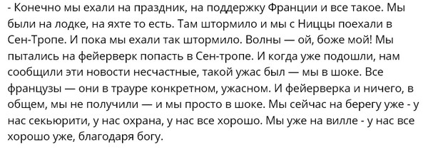 — У меня всё хорошо, только жаль, что отменили фейерверки в Сен-Тропе. А так, у нас куча охраны, супер всё! Мы отдыхали на яхте, ужинали, пришёл француз и сказал, что случился теракт какой-то, поэтому нужно уезжать, на берег возвращаться, ну, и погода плохая ещё. Мы так расстроились, хотели фейерверк посмотреть, но этот ужас случился и всё отменили! Меня отлично охраняют, без этого сейчас, конечно, никуда. С моими бриллиантами на улицу не выйдешь. Нужно минимум два телохранителя, чтоб охраняли драгоценности.