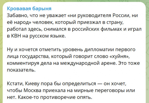 Зеленский, говорит, прям совсем не уважает ни руководителя России, ни ее народ. Неблагодарная сволочь этот Зеленский, действительно! В КВН на русском языке играл! Хлеб и сало русское ел!