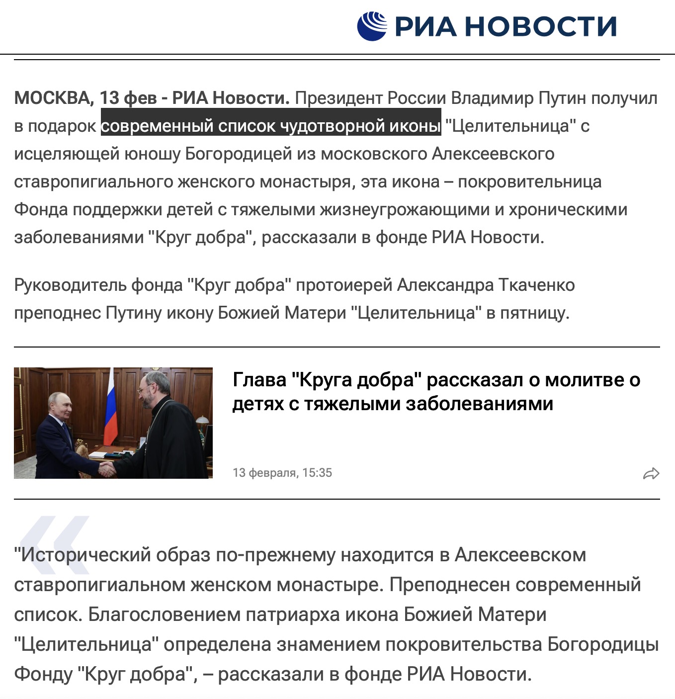 Протоиерей Александр Ткаченко отобрал у родителей тяжелобольных детей икону Божьей матери-целительницы и подарил икону Путину. Логично, да, Путину нужнее, а детишки сами как-нибудь перетопчутся.
