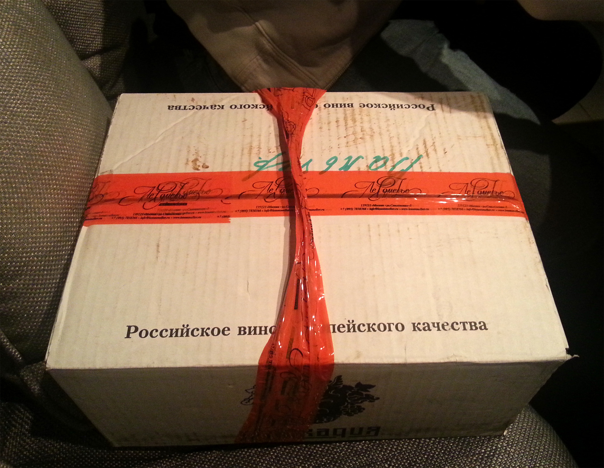 А вот небольшой ящичек российского, между прочим, вина, который приехал от Артура, причем раньше самого Артура.