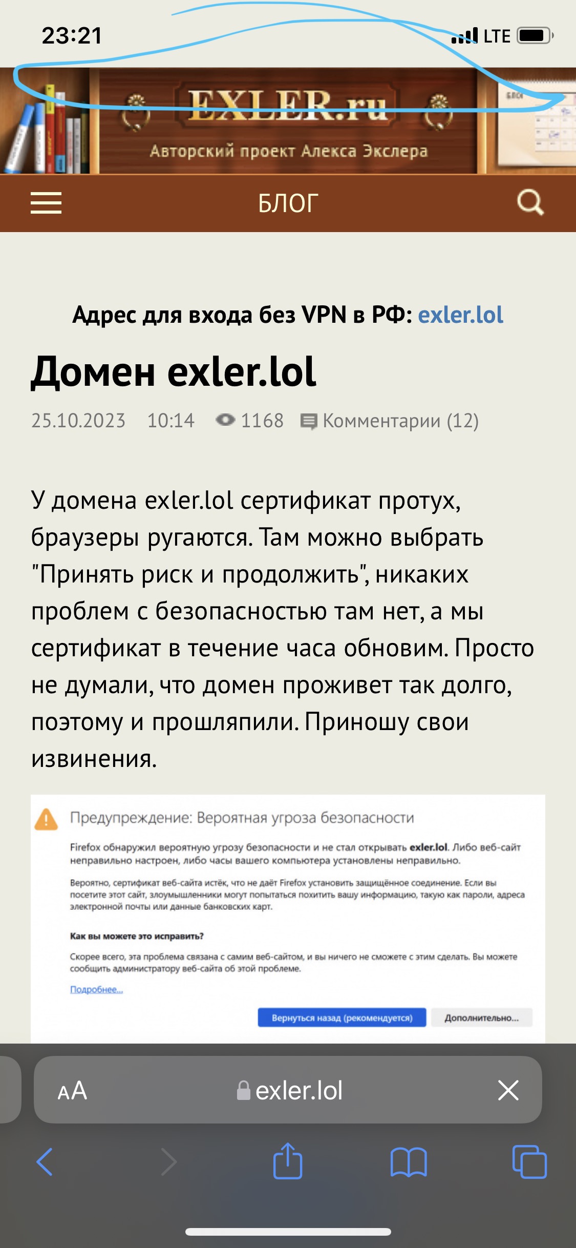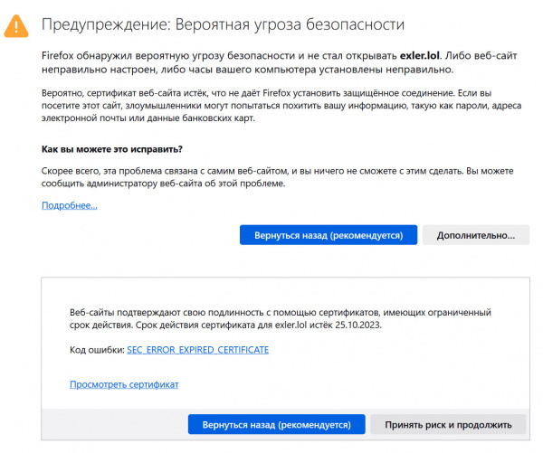 У домена exler.lol сертификат протух, браузеры ругаются. Там можно выбрать "Принять риск и продолжить", никаких проблем с безопасностью там нет, а мы сертификат в течение часа обновим. Просто не думали, что домен проживет так долго, поэтому и прошляпили. Приношу свои извинения.