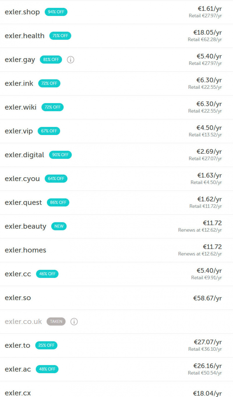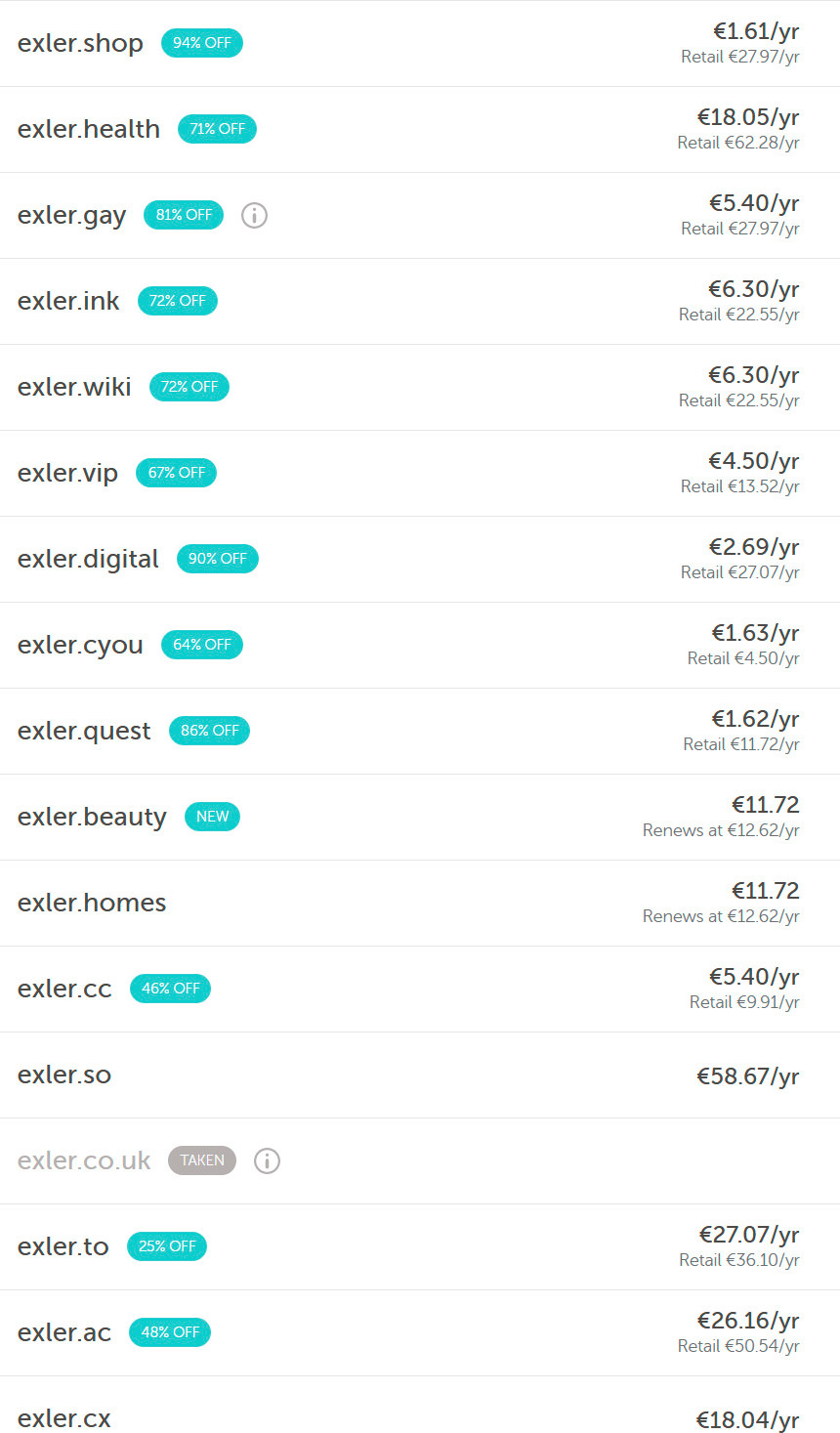Смотрел, какие свободные, ну и наткнулся на вот такую штуку. Нормальненько так за exler.inc - €1894 в год. Да и exler.art - тоже стоит кучерявенько.