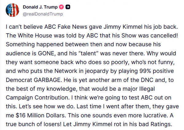 ПРЕЗИДЕНТ СОЕДИНЕННЫХ ШТАТОВ АМЕРИКИ ДОНАЛЬД ДЖ. ТРАМП изволили страшно разгневаться из-за того что ABC возвратили в эфир шоу Джимми Киммела, осмелившегося критиковать его, великого Трампа, который уже остановил семь войн, сделал Америку снова великой и ввел такие замечательные, великолепные и прекрасные тарифы.