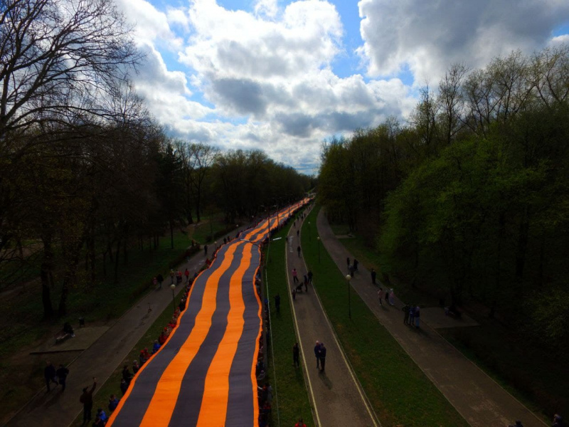 Георгиевскую ленту длинной в 300 метров и 7 метров в ширину, развернули свыше 500 смолян, пришедших в этот день в Реадовский парк. (Отсюда.)