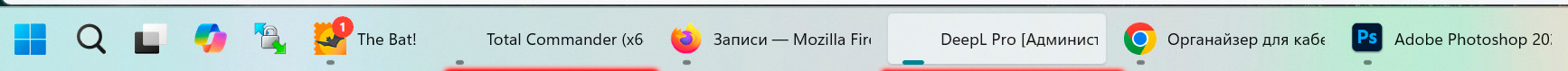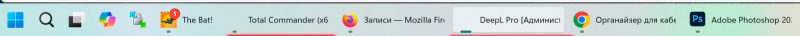 После недавнего обновления задурила панель задач (у меня она "родная", никакие навески там не стоят, мне без надобности). Периодически у каких-то запущенных приложений пропадают их иконки. Причем эффект плавающий. Например, у DeepL иконка вообще совсем пропала (на скриншоте). У Total иконка чаще есть, но тоже иногда пропадает. У Word изредка пропадает. У каких-то приложений - никогда не пропадает.
