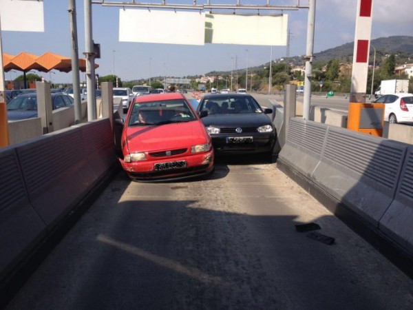 В нашей городской рассылке ржут над двумя дебилами, которые сумели не поделить пункт оплаты автострады и въехали туда одновременно. Как вообще можно было ухитриться такое сотворить - не очень понятно. Но по фото похоже, что мужик в красной машине - выдающийся феномен.