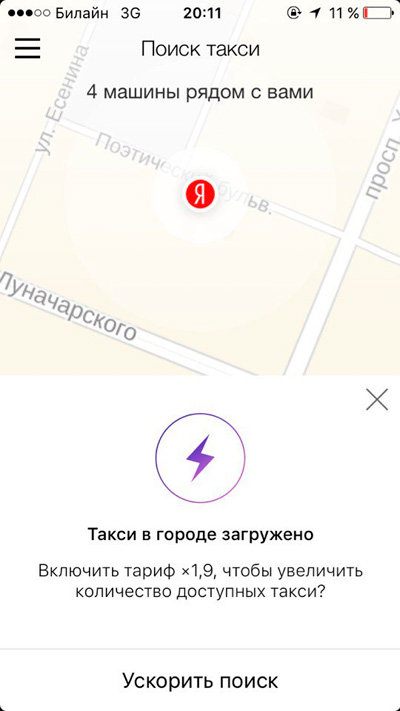 У меня недавно такое было. Яндекс.Такси сообщил, что сейчас пиковое время загрузки и тариф будет повышенный. Я согласился. В итоге я прождал 10 минут, пока Яндекс выполнял поиск свободных автомобилей. Не дождавшись, я закрыл его к чертям и запустил Убер. Через 5-7 минут машина уже стояла возле дома и по «регулярному» тарифу.