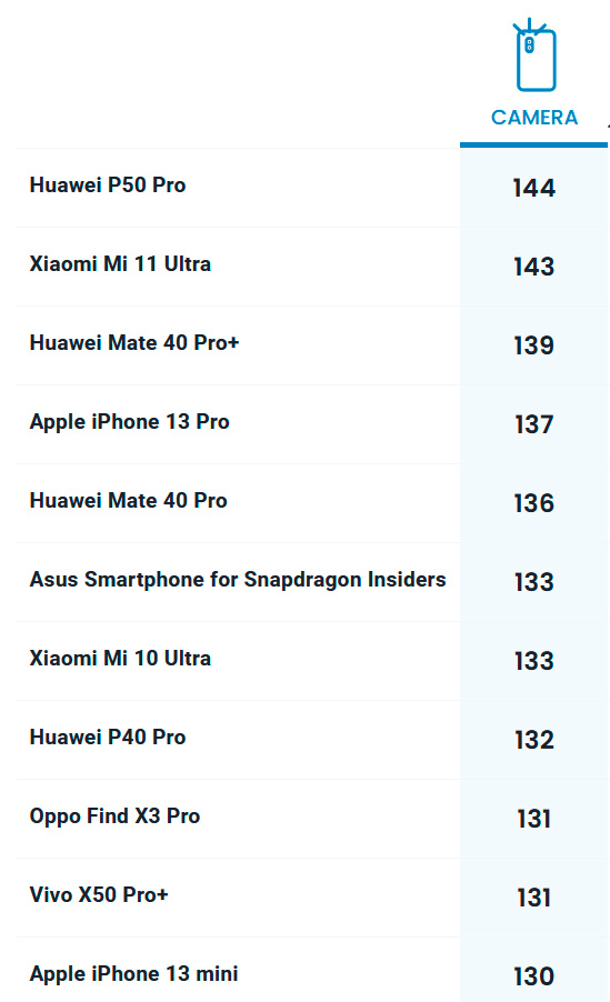 Вот большой обзор (англ.) По результатам тестирования итоговая табличка стала вот такой - iPhone 13 Pro поставили на 4-е место. iPhone 13 Mini занял 11-е место. На первом месте по прежнему Huawei P50 Pro, на втором - Xiaomi Mi 11 Ultra.