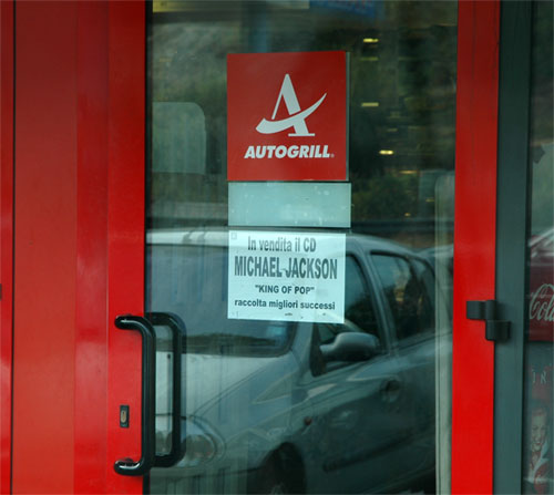 Неделю назад под Флоренцией, тоже в Автогриле, видел двухметровую пластмассовую фигуру Джексона с подносом в руках, на котором были разложены СД. Жаль, не сфотографировал.