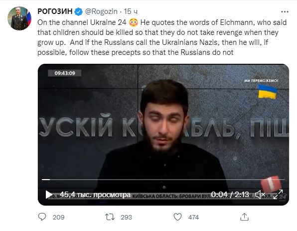 Рогозин, кстати, перепутал или намеренно исказил название канала, у него он фигурирует как "Украина 24", тогда как на деле это "24 канал". "Украина 24" это лидирующий информационный канал, который принадлежит Ринату Ахметову, тогда как "24 канал" принадлежит жене мэра Львова Садового и занимает лишь пятое место среди новостных каналов, а по всем каналам не входит даже в десятку самых популярных (там что-то около пары процентов аудитории).