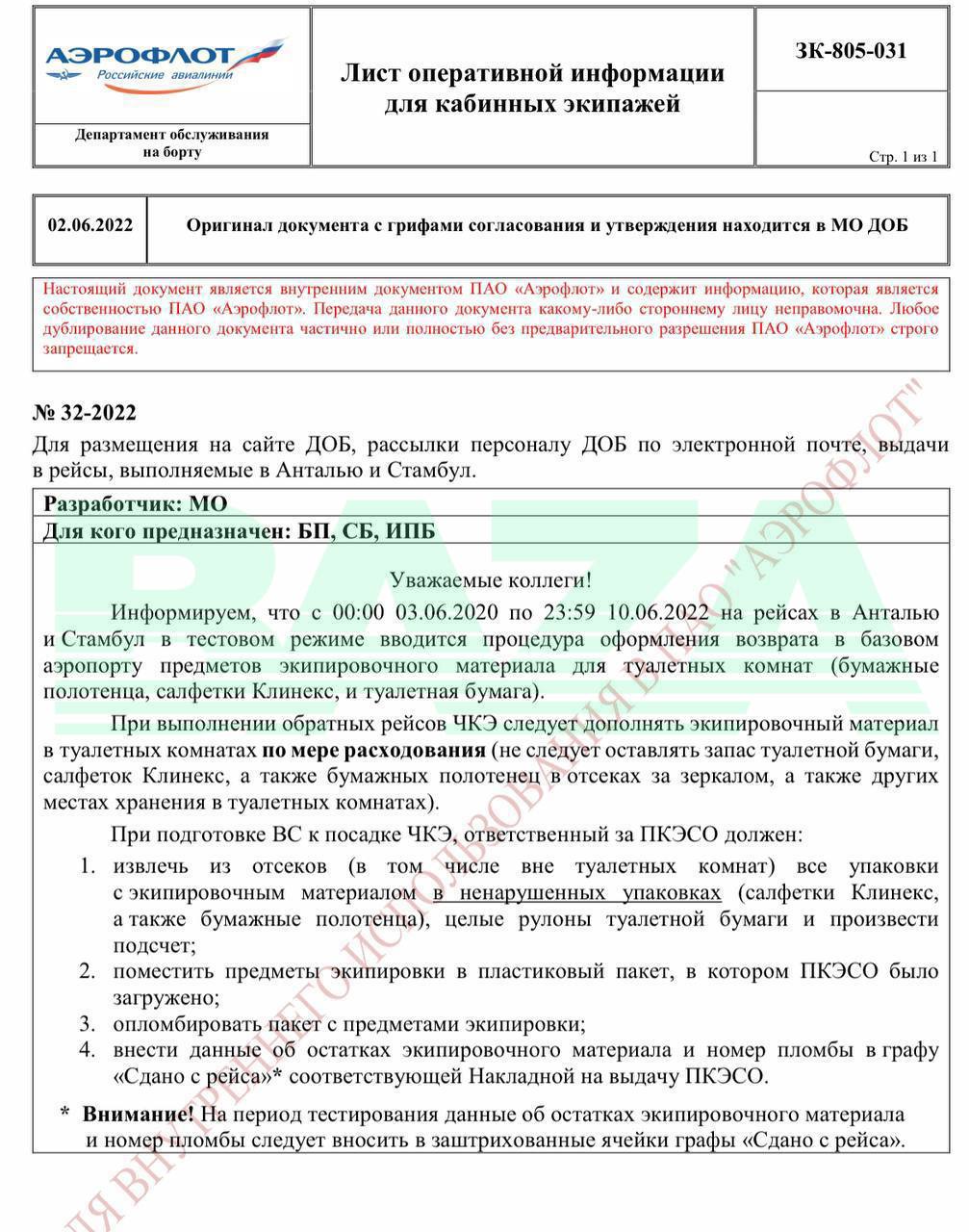 "Бортпроводники «Аэрофлота» должны вести учёт туалетной бумаги на рейсах в Турцию".