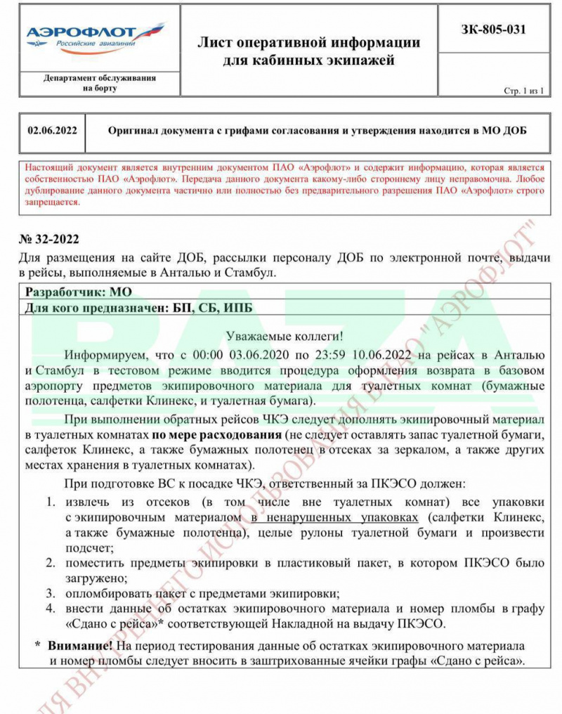 На рейсах авиакомпании теперь ведётся строгий учёт бумажной продукции: туалетной бумаги, салфеток и бумажных полотенец. Сотрудникам кабинного экипажа пришел распорядок о введении таких мер в тестовом режиме до с 3 по 10 июня. Но практику могут ввести и на постоянной основе.