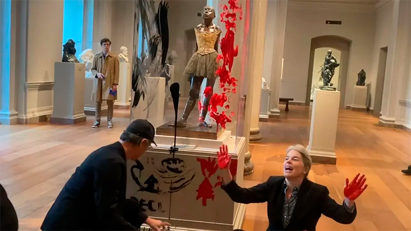 Экотеррористка (она себя называет активисткой климатического движения) Джоанна Смит, живущая в Бруклине (Нью-Йорк), и ее коллега по протесту Тимоти Мартин, проживающий в Северной Каролине, приехали в Вашингтон прошлой весной и 27 апреля 2023 года вошли в NGA с бутылками красной и черной краски, которые они затем открыли и размазали по основанию и защитному футляру скульптуры Дега. Смит и Мартин, участники группы Declare Emergency, были обвинены в нанесении ущерба экспонату NGA и сговоре с целью совершения преступления против Соединенных Штатов.