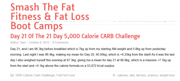Блогер Сэм Фелтхем решил провести интересный эксперимент под названием "5 тысяч килокалорий в день". Суть эксперимента состояла в том, что Сэм сначала в течение 21 дня употреблял ежедневно не менее 5000 килокалорий, причем питание у него было белково-жировое, с минимумом углеводов. Следующие 21 день он питался углеводистой пищей (макароны, хлеб, рис и всякое такое).