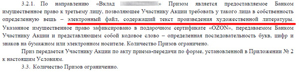 Неужели действительно не доходит, что этот банчок скорее всего дарит "текст художественного произведения" которое и так находится в свободном доступе в силу окончания действия авторских прав на него? То есть это может быть, например, "Робинзон Крузо". Одним словом - вы нам 100 тыс. руб., а мы вам в подарок - лишь солнца свет да небес синеву.