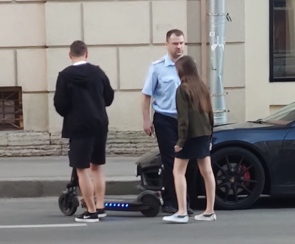 Сфоткал как гаишник остановил парочку на электросамокате, они ехали по дороге. После непродолжительной беседы он их отпустил и ребята продолжили путь по тротуару.