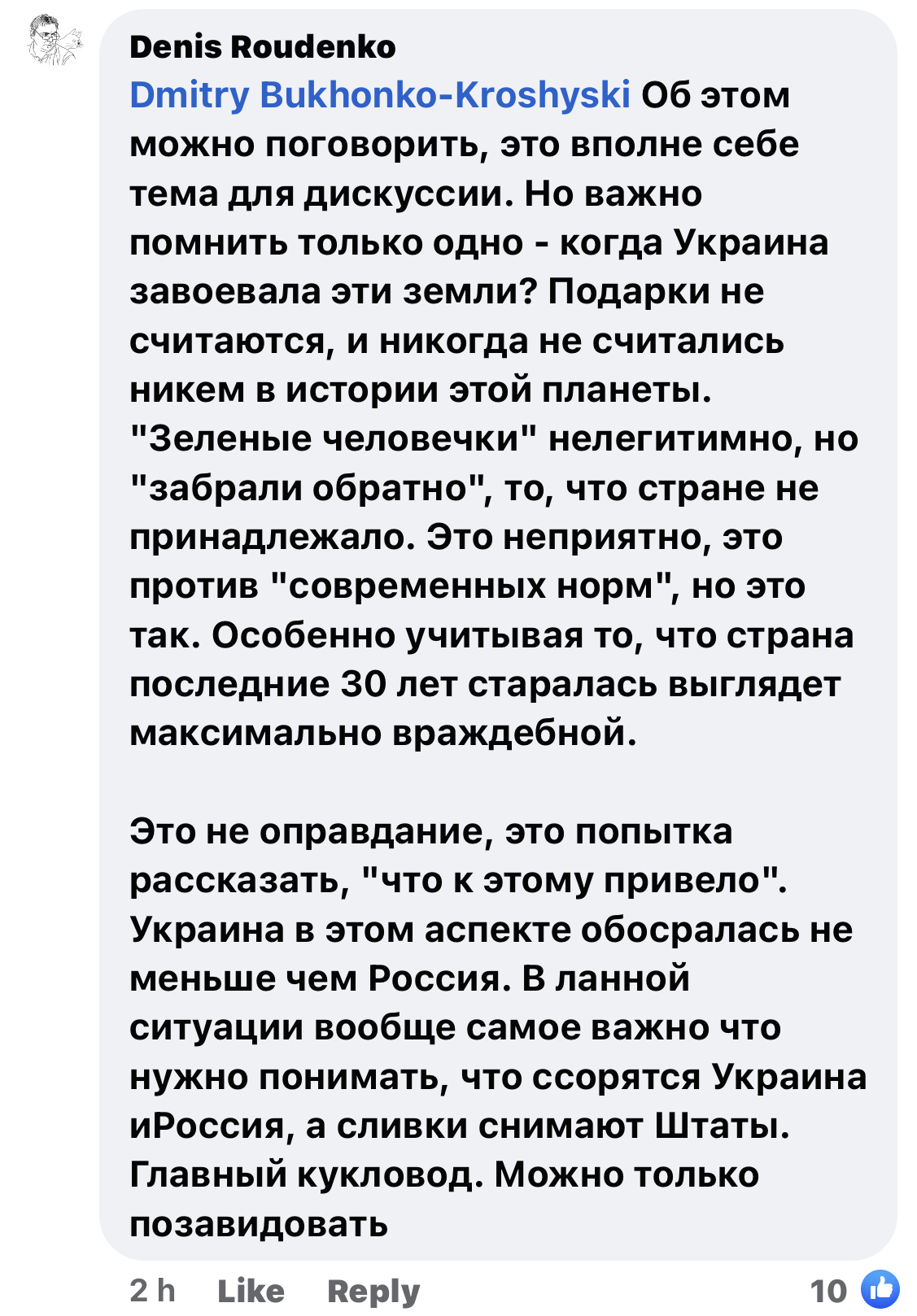 "Но важно помнить только одно - когда Украина завоевала эти земли? Подарки не считаются, и никогда не считались никем в истории этой планеты. "Зеленые человечки" нелегитимно, но "забрали обратно", то, что стране не принадлежало. Это неприятно, это против "современных норм", но это так. Особенно учитывая то, что страна последние 30 лет старалась выглядет максимально враждебной.