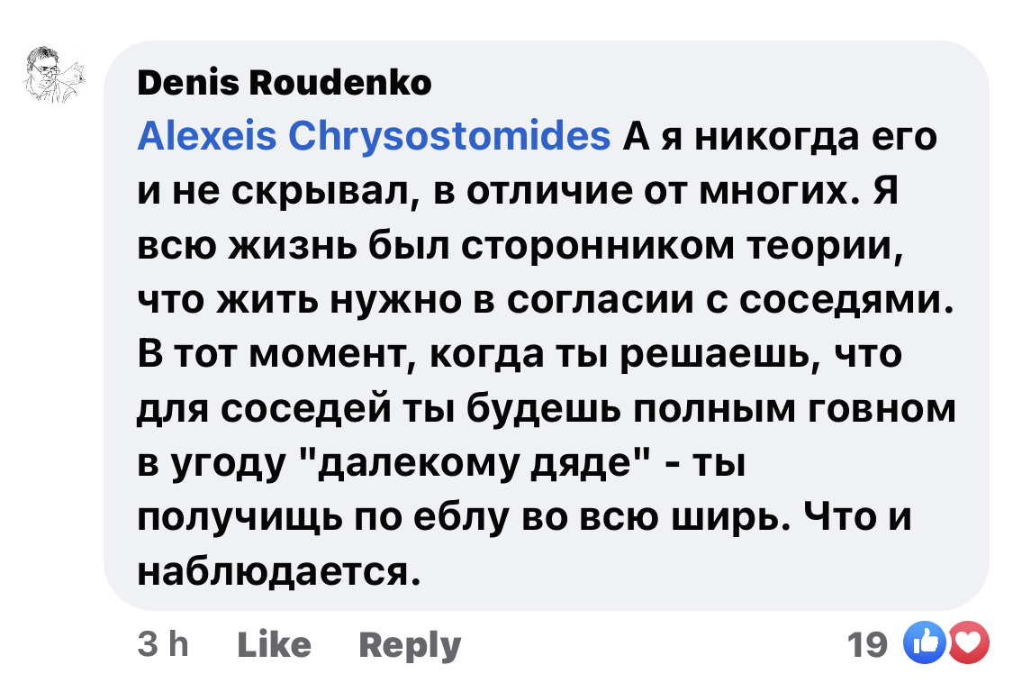 "Я всю жизнь был сторонником теории, что жить нужно в согласии с соседями. В тот момент, когда ты решаешь, что для соседей ты будешь полным говном в угоду "далекому дяде" - ты получищь по еблу во всю ширь. Что и наблюдается."