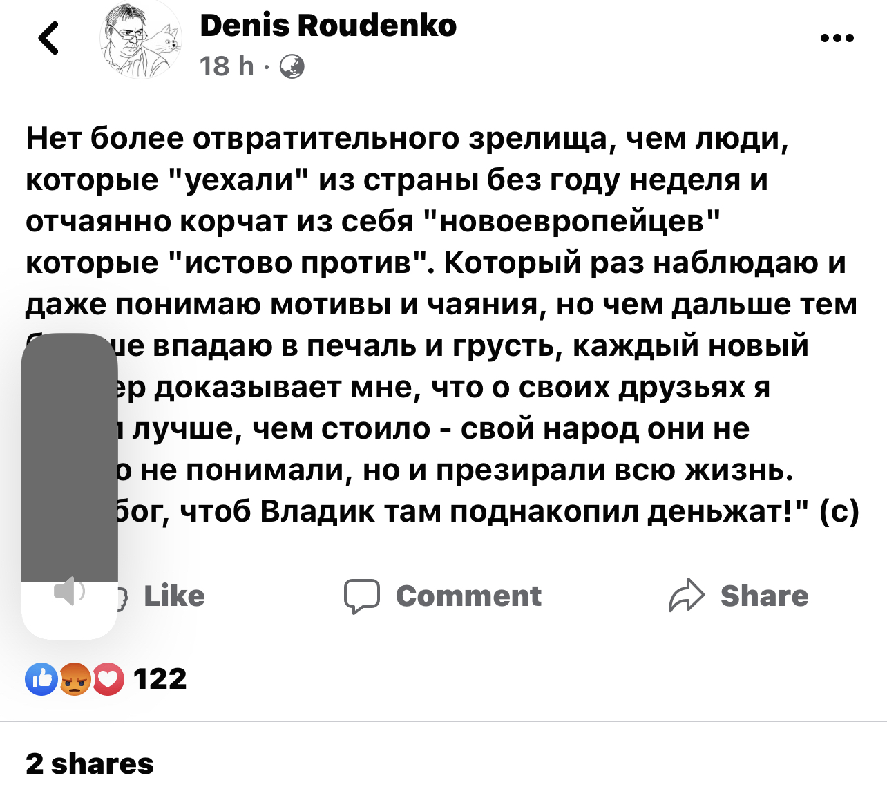 Сам пост Руденко: "Нет более отвратительного зрелища, чем люди, которые "уехали" из страны без году неделя и отчаянно корчат из себя "новоевропейцев" которые "истово против". Который раз наблюдаю и даже понимаю мотивы и чаяния, но чем дальше тем больше впадаю в печаль и грусть, каждый новый пример доказывает мне, что о своих друзьях я думал лучше, чем стоило - свой народ они не только не понимали, но и презирали всю жизнь.