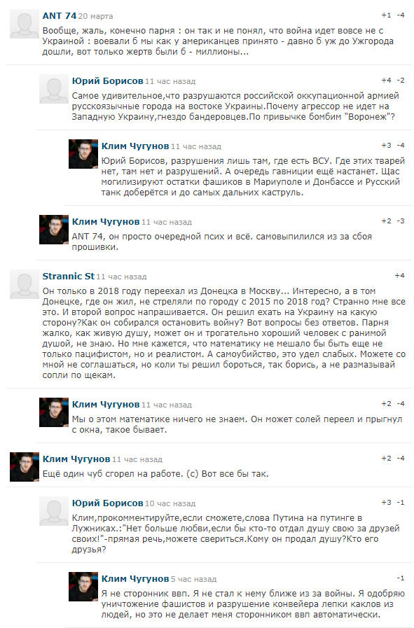 Да, там оно совершенно искренне несет такую чушь собачью... Он, видимо и вправду думает, что в Украине никакая не война идет, а так, междусобойчик.