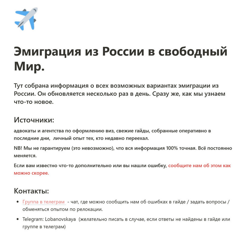 Большая и постоянно обновляемая подборка с самой разнообразной информацией о том, каким образом сейчас можно попытаться выбраться из России.