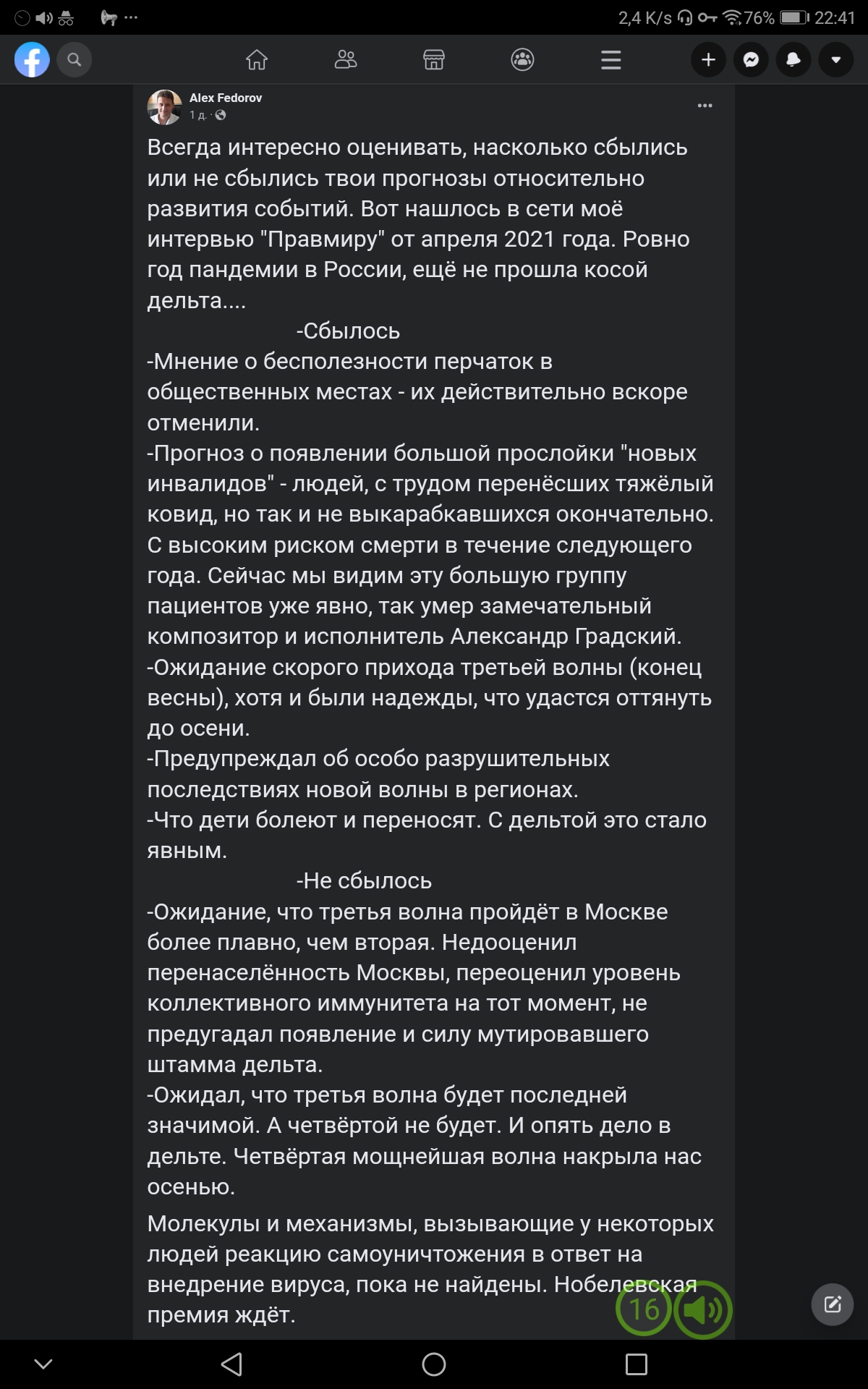 После болезни уже можно только помогать с восстановлением в зависимости от проблем. И если с восстановлением функции лёгких или психическими проблемами хотя бы понятно, что делать (физиотерапия, психотерапия), то что делать с синдромом хронической усталости, когда молодой и активный до болезни человек теперь не может подняться по лестнице за один раз и не может работать больше одного-двух часов подряд, то тут непонятно, как ему помогать. Удивительно, что вы так много внимания уделяете последствиям локдаунов для экономики, но не учитываете последствия болезни и периода восстановления. Некоторые люди полгода или дольше вынуждены находиться на больничном. Для скорейшего восстановления экономики лучше всего было бы, если бы все привились. Включая работающих людей не из группы риска.