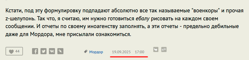 Кстати, под эту формулировку подпадают абсолютно все так называемые "военкоры" и прочая z-шелупонь. Так что, я считаю, им нужно готовиться ебалу рисовать на каждом своем сообщении. И отчеты по своему иноагенству заполнять, а эти отчеты - предельно дебильные даже для Мордора, мне присылали ознакомиться.