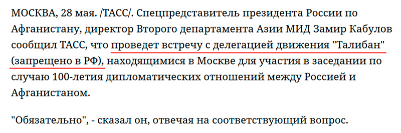 Будет желание - позже сможем обсудить тонкости понятий "террористическая деятельность", "террористическая организация" в российском законодательстве, а также фактическое состояние дел в Афганистане, и почему с "Талибаном" сейчас разговаривают на уровне дипломатических миссий.