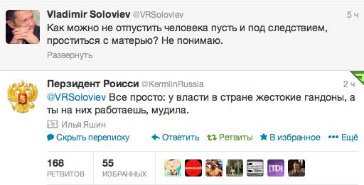 Reorn: Обозвал Соловьева "гандоном" и "мудаком", и теперь на что-то рассчитывает. Я бы на месте Соловьева обиделся настолько, что устроил бы показательную травлю всех либиралов. Ну, чисто в порядке маленькой личной мести. Такими постами власть же просто толкают к расправе с "белоленточной оппозицией". Уж не знаю, от большого ума или наоборот. Но скатывание власти к тупой махровой реакции именно в данном случае выглядит весьма закономерно и предсказуемо.