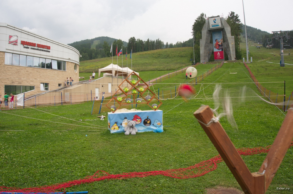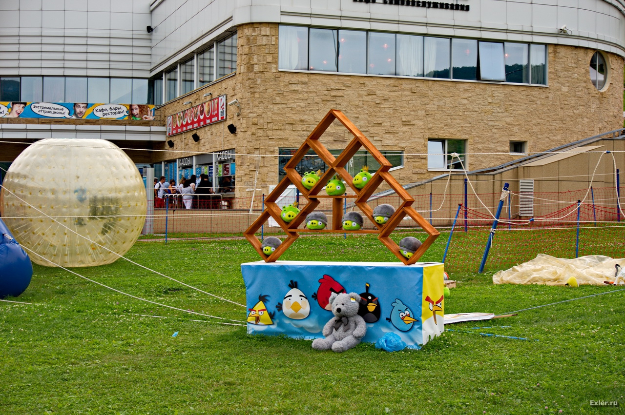 Мне удалось сделать забавный кадр: ребенок из рогатки запускает особенно сердитую птичку прямо в центр свинского сборища. На заднем плане двое работников толкают вверх шар, в котором можно прокатиться, кувыркаясь, по специальной дорожке. Наверное, интересное развлечение: одна туристка внутри шара так визжала, что я думал - шар не выдержит и лопнет.