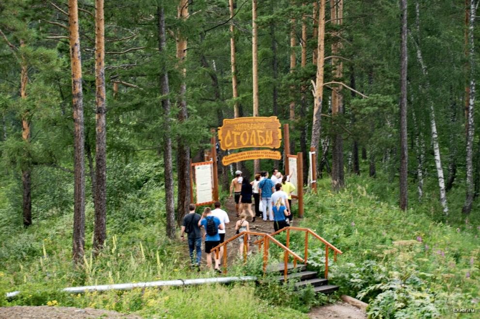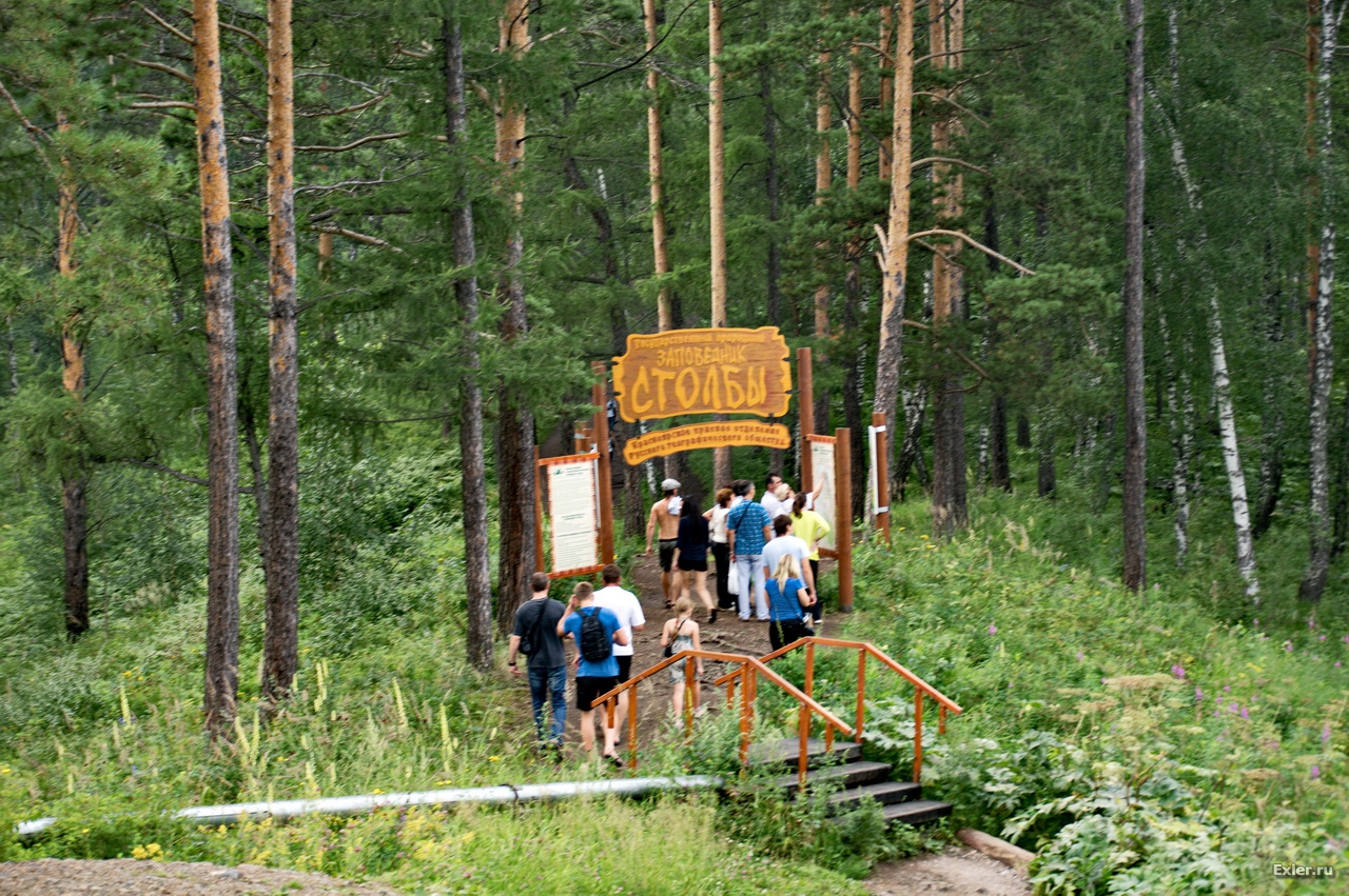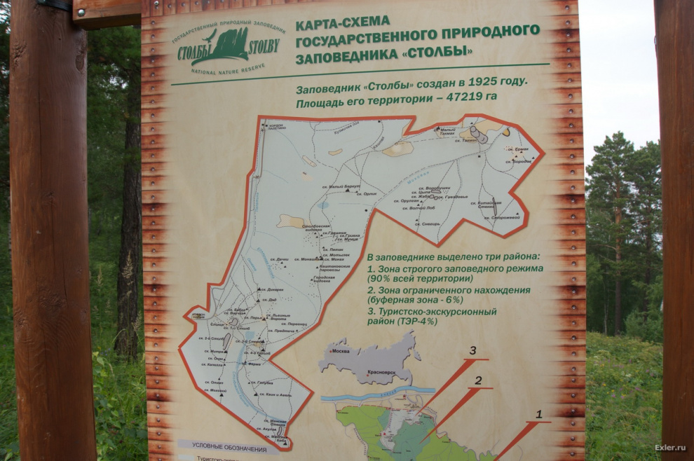 Вход в заповедник. С этой точки более или менее стандартный маршрут к различным столбам - 12 километров. Но маршруты, вообще говоря, могут быть какие угодно - вот, например, куча информации по столбам, фрагментам и маршрутам на профильном сайте.
