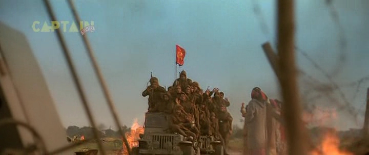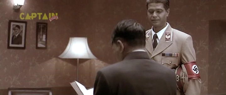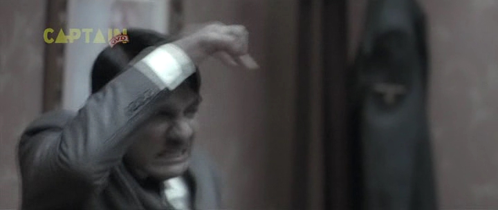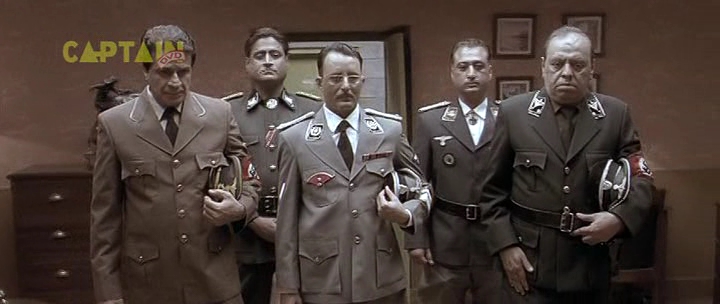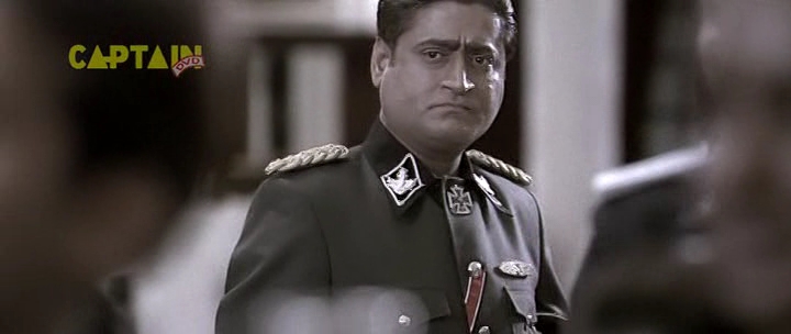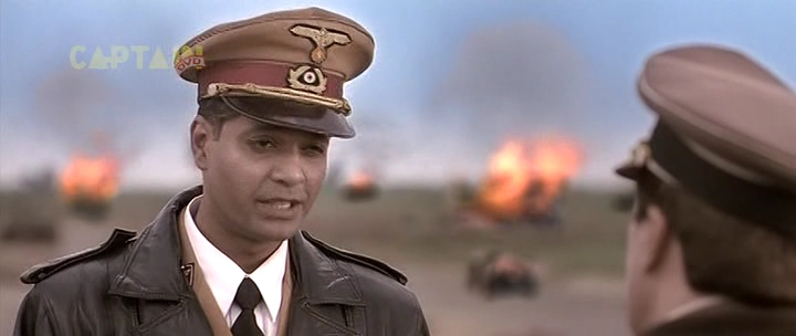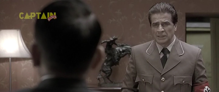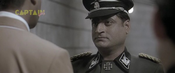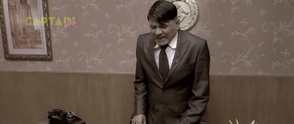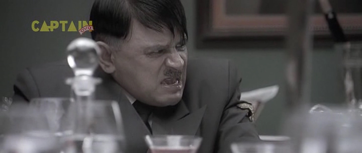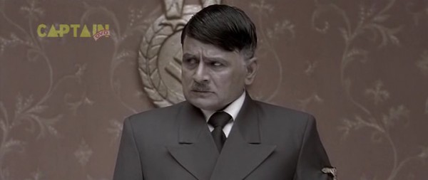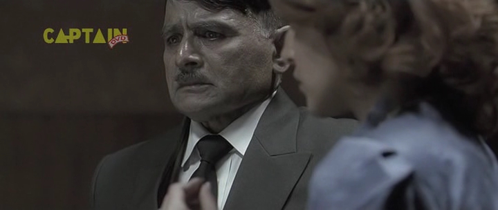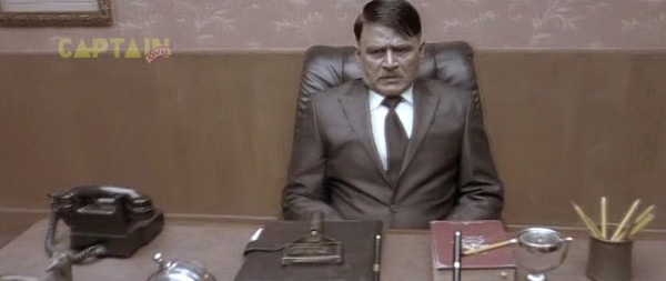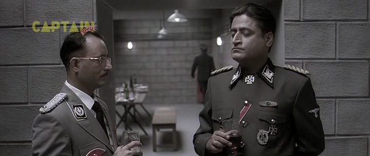 Бункер, 1945 год. А тут и Гитлер нарисовался. Колоритный такой. Росточком с сидящую собаку, в цивильном костюмчике с галстучком (он в основном в нем почти весь фильм и проходит). Прикол в том, что актеру Рагувиру Ядаву на его седые волосы нацепили брюнетистую нашлепку с косым проборчиком, а из-под нашлепки выглядывает его седина. Смотрится это, конечно, колоритно, но предельно нелепо. К тому же всю глубину переживаний фюрера Ядав изображает таким взглядом, как будто Гитлер страдает многодневным запором. И этот взгляд не меняется у него на протяжении всего фильма - большого дарования актер, большого дарования.