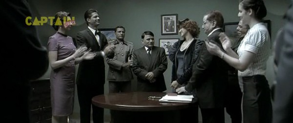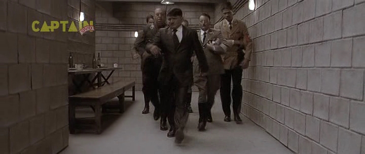 В коридорах бункера массовка изображает знаменитую сцену из фильма "Бункер".