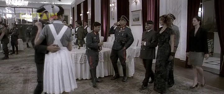 В этот момент на продолжающейся вечеринке Ева Браун танцует на столе и поет.