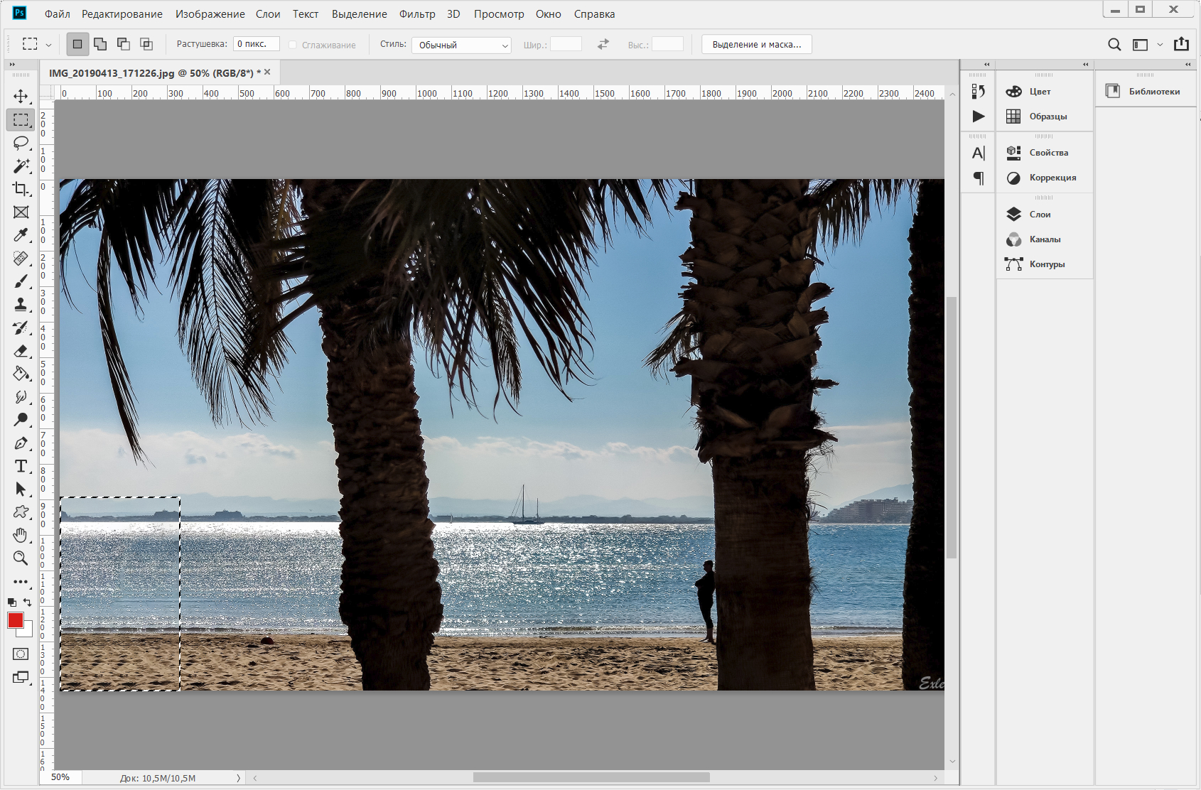 Гружу в "Фотошоп". Выделяю прямоугольник и делаю заливку с учетом содержимого. Очевидная разница, не так ли?