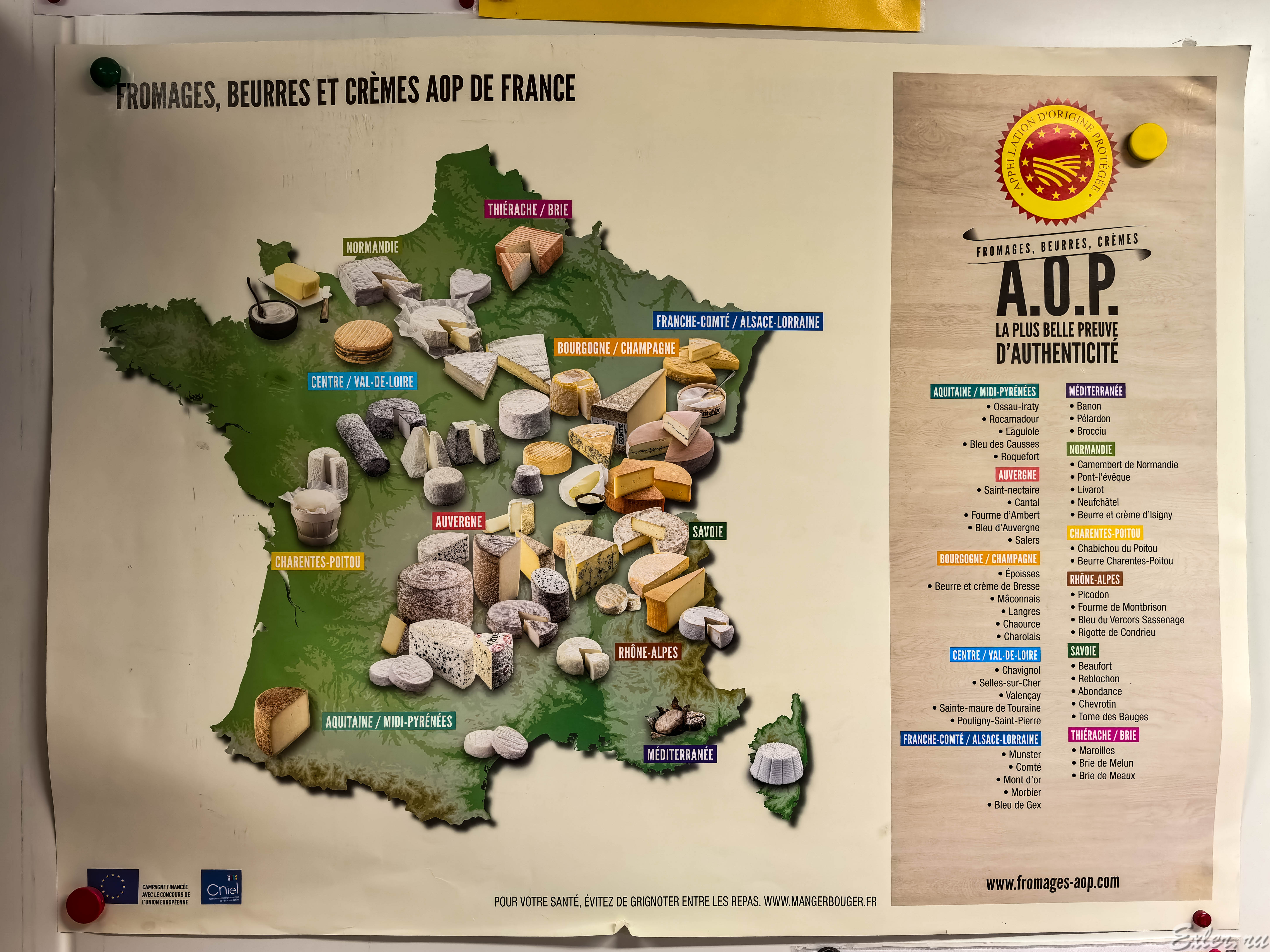 Вчера заезжали в очень популярный магазин местных сыров в городе Шаурсе (очень люблю их местный сыр шаурс - мягкий с белой плесенью) - увидел вот такой любопытный плакатик с видами сыров из различных регионов Франции.