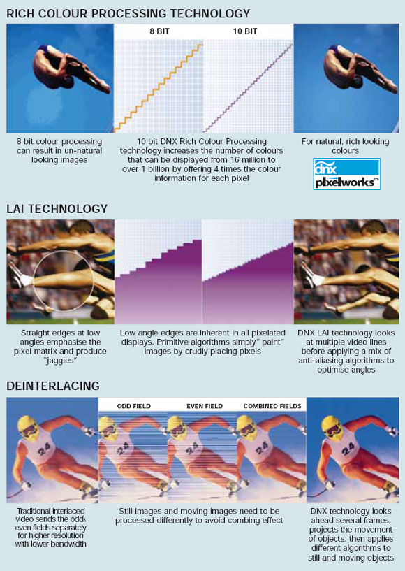 10-битный видеопроцессор Pixelwork хорошо обрабатывает некачественное изображение, заметно его улучшая. На картинке видно, что именно он делает: