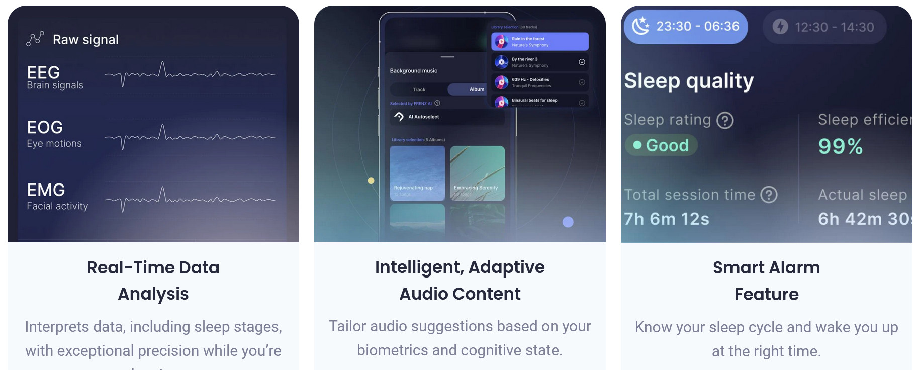 RENZ Brainband - это, как утверждается, первый в мире удобный носимый прибор для отслеживания мозговой активности клинического уровня со встроенными динамиками костной проводимости. Устройство в режиме реального времени с большой точностью фиксирует сигналы мозга (ЭЭГ), многочисленные биопоказатели (SpO2, пульс, ритм дыхания), движения головы, микродвижения лица (ЭМГ) и движения глаз (ЭОГ). Анализируя эти сигналы, FRENZ активирует "клинически проверенные", персонализированные когнитивно-поведенческие аудиотреки через динамики костной проводимости, чтобы вызвать более быстрое начало сна, более глубокий сон, более быстрое возвращение ко сну при пробуждении и более бодрый подъем.