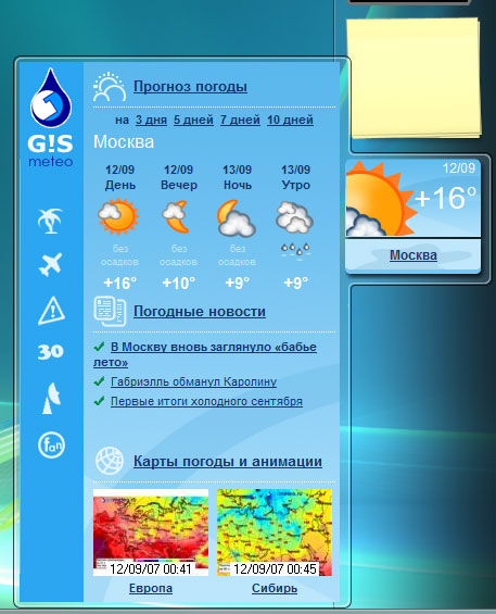 Gismeteo разразилось новым гаджетом (мини-приложением для боковой панели) для Vista. В отличие от старого и убогого, новый - просто супер. В закрытом состоянии показывает погоду на данный момент. В открытом - кучу всего. Выглядит стильно и информативно, тащусь.