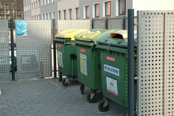 Как это нет? У них такие контейнеры стоят всегда по три, и разных цветов - для бумаги, для пластика и для стекла. У нас такое где?