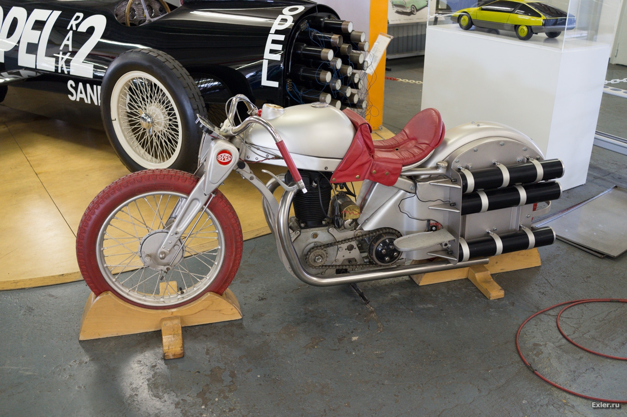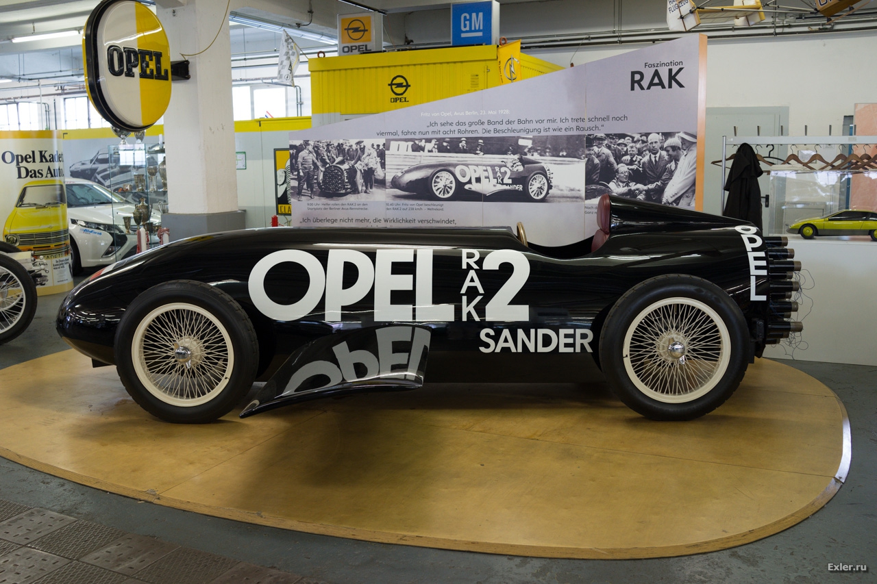 А это легендарный Opel RAK 2 Sander. Автомобиль с ракетным двигателем. Безбашенный Фриц фон Опель на этом автомобиле разогнался в 1928 году до 238 км/ч - это был мировой рекорд. Причем первая модель этого автомобиля на испытаниях взорвалась. Но Фрица это не остановило.